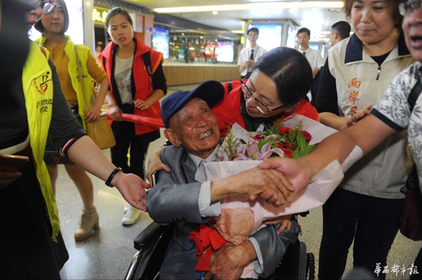 當(dāng)晚9點(diǎn)45分左右,胡定遠(yuǎn)坐在機(jī)場(chǎng)提供的輪椅上,出現(xiàn)在了眾人的視野里。面對(duì)前來(lái)迎接的志愿者,胡老微笑著,點(diǎn)頭、揮手以示回應(yīng),還用地道的瀘州話不斷說(shuō)著“謝謝”。同時(shí),他的目光始終在打量周圍的景象,70余年時(shí)光飛逝,這里的景象早非當(dāng)年。“估計(jì)老家沒(méi)人認(rèn)識(shí)我了。”胡老輕嘆。