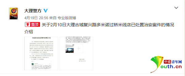 中國(guó)青年網(wǎng)北京4月20日電 (見習(xí)記者 劉利影) 4月19日,一則“大理古城復(fù)興路老板與游客發(fā)生肢體沖突”的視頻在微博上傳播。4月19日晚,大理市公安局通過官方微博發(fā)布情況通報(bào)稱,網(wǎng)傳視頻系2月10日大理古城米線店因糾紛引發(fā)治安案件的現(xiàn)場(chǎng)視頻,游客因食鹽味淡與店主發(fā)生口角后雙方扯打在一起,案件處理中雙方已和解并簽訂調(diào)解協(xié)議。