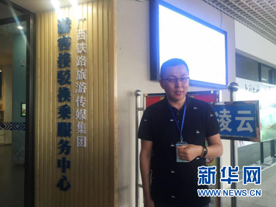畢海斌在百色車站游客接駁換乘服務(wù)中心介紹高鐵無軌站相關(guān)情況。新華網(wǎng) 聶晨靜 攝