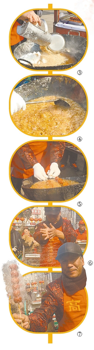 糖漿停當(dāng)后,將鍋傾斜,拿著串好的糖球在鍋中一轉(zhuǎn),順勢提起將其“倒立”,兩只手掌夾緊竹簽一轉(zhuǎn),新出鍋的糖漿在空中一甩,便成了晶瑩的細(xì)絲凝固下來,火紅的糖球變戲法似的“開了花”,包裹在一層晶瑩剔透的白色之中,一抹紅色在其中隱隱約約,美其名曰“雪里紅”,此系高家獨(dú)創(chuàng)制作技藝。