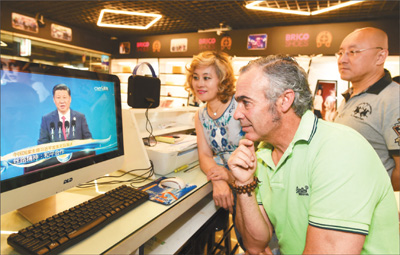浙江義烏的西班牙客商正在收看“一帶一路”國(guó)際合作高峰論壇開(kāi)幕式。