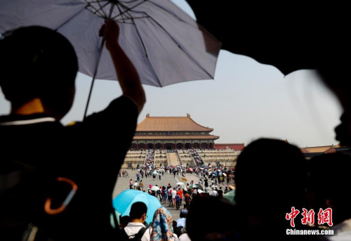 5月18日,游客在北京故宮博物院參觀,北京持續(xù)高溫。中新社記者 杜洋 攝
