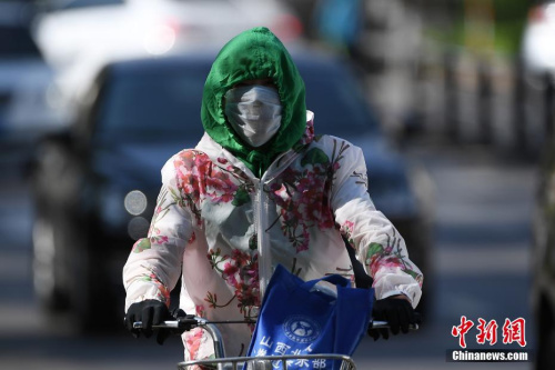 5月17日,山西太原,民眾在烈日下“全副武裝”出行。武俊杰 攝