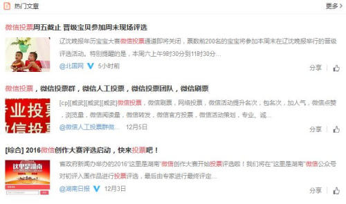 求贊拉票本來(lái)是在拼人氣,但也成為一些人的煩惱。為了在“票”數(shù)上一決雌雄,求贊票者不遺余力,撒錢(qián)拉人獎(jiǎng)品引誘,各顯其能。對(duì)于接受“點(diǎn)贊”任務(wù)的朋友們,礙于情面,不論事實(shí)怎樣,動(dòng)動(dòng)拇指做個(gè)順?biāo)饲,但時(shí)間久了,也是惹人煩、不勝其擾?梢哉f(shuō),求贊拉票已經(jīng)為朋友圈一大累贅,一大負(fù)擔(dān)。更令人匪夷所思的是,“刷票”,不僅在比實(shí)力,拼人脈,還可以搞“產(chǎn)業(yè)”。在網(wǎng)上搜索“微信投票”,很快就能出現(xiàn)“微信人工刷票”“微信投票群”“微信投票團(tuán)隊(duì)”等收費(fèi)刷票的信息,可見(jiàn)其背后潛藏著的利益鏈條。