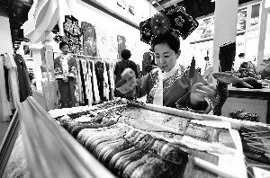 東北渤海靺鞨繡參加北京國際服務(wù)貿(mào)易交易會(huì)展出。 北京晨報(bào)記者 李木易/攝