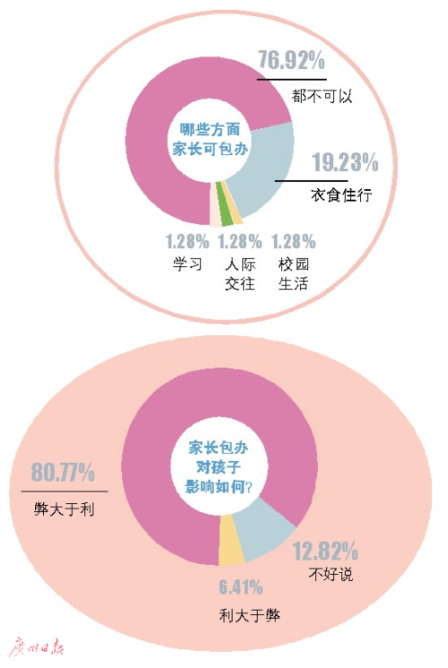 日前,本報(bào)在網(wǎng)上對(duì)“家長(zhǎng)包辦”這一話題進(jìn)行了調(diào)查,發(fā)現(xiàn)在以家長(zhǎng)為主的受訪者中,有超過(guò)八成的人認(rèn)為家長(zhǎng)包辦“弊大于利”,然而在現(xiàn)實(shí)中,許多家長(zhǎng)卻意識(shí)不到自己的行為是“包辦”。不僅孩子們不喜歡,也有不少因?yàn)榧议L(zhǎng)愛(ài)“包辦”而感到郁悶的老師。教育專家表示,家長(zhǎng)包辦、干預(yù)、照顧得太多,對(duì)孩子的成長(zhǎng)會(huì)造成較大的負(fù)面影響,容易高分低能。因此,在孩子成長(zhǎng)的每一個(gè)階段,家長(zhǎng)都應(yīng)該適時(shí)放手。