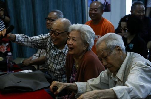 在互動環(huán)節(jié)中,管宗祥先生的夫人、著名表演藝術(shù)家于黛琴帶領(lǐng)的北影社區(qū)老年朗誦隊進行了精彩的朗誦表演。這支由退休老人組成的朗誦隊,在于老師的辛勤指導(dǎo)下,成為了一支經(jīng)常活躍在社區(qū)和各種公益活動的出色的朗誦團體。此后,于老師一首聲情并茂、感人至深的詩朗誦,得到觀眾熱烈的掌聲。
