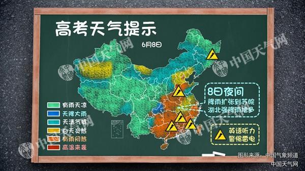 高考期間,陜西南部、華北南部和黃淮中西部可能出現(xiàn)雷電、大風(fēng)等強(qiáng)對流天氣,提醒考生和家長們一定要注意防范降雨以及雷電、大風(fēng)等強(qiáng)對流天氣的不利影響;此外8日夜間至9日白天四川盆地至江淮一帶有強(qiáng)降雨,部分地區(qū)發(fā)生地質(zhì)災(zāi)害的氣象風(fēng)險(xiǎn)較高,需注意防范降雨可能引發(fā)的滑坡、泥石流等災(zāi)害。