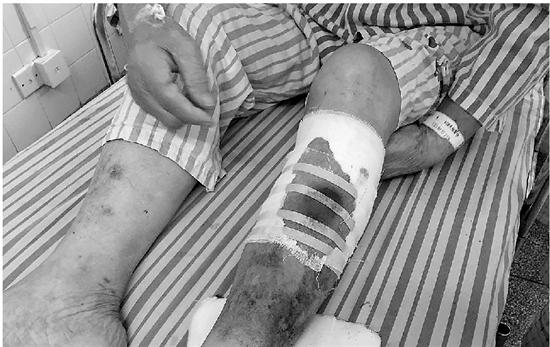 84歲的何大伯躺在病床上,左小腿纏著紗布,傷口滲出的血把紗布染紅了。