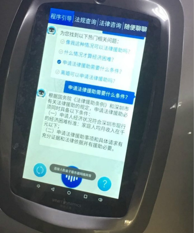 "龍華小法"法律援助機器人高1.48米,云端存儲10萬余條法律法規(guī)、3萬個典型案例數(shù)據(jù)、5000多條案情分析點及海量專業(yè)問答信息。現(xiàn)已具有“申請援助、援助審查、援助實施、法律咨詢、申請支付令、交通事故、熱點問題及其他”八大服務(wù)功能。不僅可幫助解決公眾工作生活中經(jīng)常遇到的法律問題,更可24小時通過“援助實施”模塊與法援中心當值律師實現(xiàn)音視頻連接,解決其個性化法律問題。
