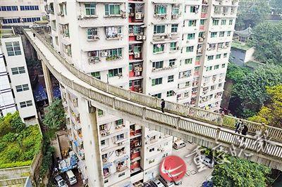 微博上曾有一組照片顯示渝中區(qū)一處天橋,橋的一端從地面連接到另一棟樓的13層。該微博發(fā)出后,引發(fā)了網(wǎng)友對(duì)該天橋所在地的各種猜想。