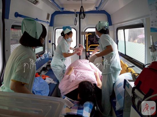 麥女士的家離白云區(qū)第二人民醫(yī)院很近,車程約十分鐘,救護(hù)車的空間不大,車上有葉發(fā)卓醫(yī)生,謝麗紅、鄺淑芬兩位急診護(hù)士,麥女士以及其丈夫,還有一名即將誕生的寶寶。疼痛中的麥女士不斷發(fā)出痛苦的呻吟聲,全車的人均十分緊張焦急,臨危受命第一次負(fù)責(zé)接產(chǎn)的葉發(fā)卓滿頭是汗,時(shí)刻盯緊嬰兒出來的情況,精神高度集中。