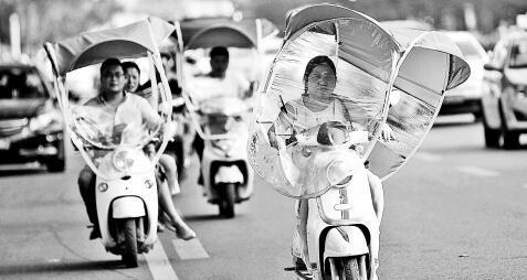 高溫下,不少電動車裝上遮陽篷,躲避太陽的暴曬