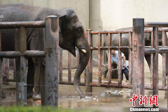 圖為飼養(yǎng)員給大象淋浴!№n璐 攝