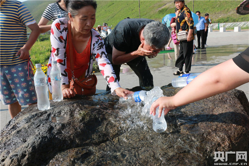 游客正拿礦泉水瓶取水直引。(央廣網(wǎng)記者 吳海波 攝)
