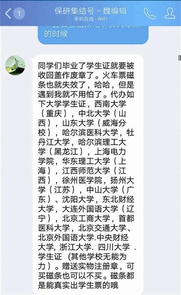 北青報記者在加其名為“保研集結(jié)號~魏編輯”的QQ號后,對方立即發(fā)來“同學(xué)們畢業(yè)了學(xué)生證就要被收回蓋作廢章了;疖嚻贝艞l也就失效了,哈哈,但是遇到我不怕……”的消息,同時發(fā)出的可以代辦的大學(xué)學(xué)生證的學(xué)校名,其中包括首都醫(yī)科大學(xué)、北京交通大學(xué)、北京外國語大學(xué)、浙江大學(xué)、四川大學(xué)等全國二十余所高校。隨后還發(fā)來“260元帶磁條,70元只辦學(xué)生證但會送假磁條,贈送實物注冊章”等字樣。