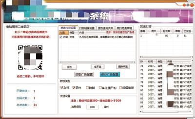 隨后,北青報(bào)記者在淘寶上隨機(jī)找了一家店鋪,對另一功能相同的軟件進(jìn)行咨詢。該店家表示可以試用,并給北青報(bào)記者傳來了試用版的軟件,該軟件的操作與上述網(wǎng)站的產(chǎn)品相似,均是編輯好文字及圖片內(nèi)容后生成二維碼,他人掃碼時只要不關(guān)閉電腦即可。北青報(bào)記者統(tǒng)計(jì)發(fā)現(xiàn),從掃碼到系統(tǒng)自動向300多名好友發(fā)送完消息只需五分鐘,但約有20名好友沒有接收到該消息。該淘寶賣家稱,該軟件由自己的團(tuán)隊(duì)協(xié)作研發(fā),群發(fā)上限為800人,目前市場價為一年500元。
