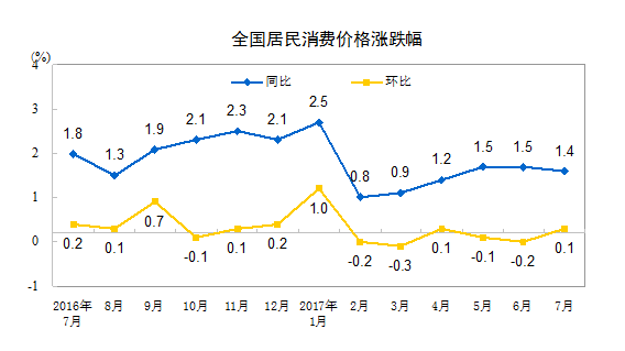 新華網(wǎng)北京8月9日電 國家統(tǒng)計局今日發(fā)布2017年7月主要經(jīng)濟數(shù)據(jù)。數(shù)據(jù)顯示,2017年7月份,全國居民消費價格同比上漲1.4%。1-7月平均,全國居民消費價格總水平比去年同期上漲1.4%。7月份,全國居民消費價格環(huán)比上漲0.1%。
