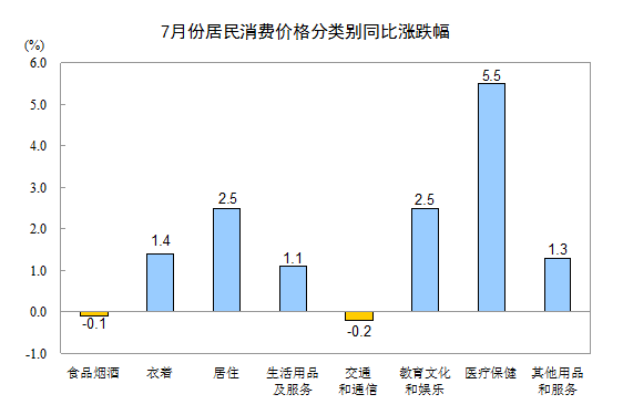 7月份,其他七大類價格同比六漲一降。其中,醫(yī)療保健價格上漲5.5%,居住、教育文化和娛樂價格均上漲2.5%,衣著、其他用品和服務、生活用品及服務價格分別上漲1.4%、1.3%和1.1%;交通和通信價格下降0.2%。