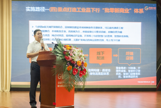 作為本次論壇的主辦方之一,中國供銷電子商務(wù)有限公司常務(wù)副總經(jīng)理戴海濤,做了題為《發(fā)揮供銷社優(yōu)勢,構(gòu)建農(nóng)村電商新格局》的專題報(bào)告。在報(bào)告中,戴總以供銷e家業(yè)務(wù)定位及商業(yè)模式為例,向與會(huì)人員詳細(xì)介紹了供銷e家關(guān)于打造縣域“新商業(yè)”體系的一些成功經(jīng)驗(yàn),并匯報(bào)了平臺上線后取得業(yè)績:截至今年上半年,“供銷e家”已累計(jì)建設(shè)各級運(yùn)營中心224個(gè),村級綜合服務(wù)網(wǎng)點(diǎn)突破23,000個(gè),全國申請批復(fù)的地方運(yùn)營平臺326個(gè),其中在線運(yùn)營PC端184個(gè)、APP端132個(gè),在線商品逾7萬,全國注冊會(huì)員逾300萬,全系統(tǒng)銷售規(guī)模突破36億,預(yù)計(jì)全年實(shí)現(xiàn)80億,供銷e家已經(jīng)成為推動(dòng)農(nóng)村發(fā)展農(nóng)民增收的中堅(jiān)力量。在介紹縣域“新商業(yè)”體系時(shí),戴總重點(diǎn)解讀了聚焦農(nóng)產(chǎn)品上行和工業(yè)品下行,天網(wǎng)地網(wǎng)雙網(wǎng)支撐,兩端拉動(dòng)樹品牌、引流量、做營銷賦能整合,構(gòu)建監(jiān)督管理體系、數(shù)據(jù)共享體系等供銷e家最核心的商務(wù)項(xiàng)目和運(yùn)營模式。