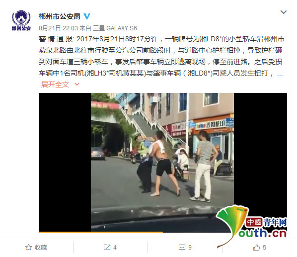 通報(bào)中披露了此事的更多細(xì)節(jié):2017年8月21日8時(shí)17分許,一輛牌號(hào)為湘LD8*的小型轎車沿郴州市燕泉北路由北往南行駛至公汽公司前路段時(shí),與道路中心護(hù)欄相撞,導(dǎo)致護(hù)欄砸到對(duì)面車道三輛小轎車,事發(fā)后肇事車輛立即逃離現(xiàn)場,停至前進(jìn)路。