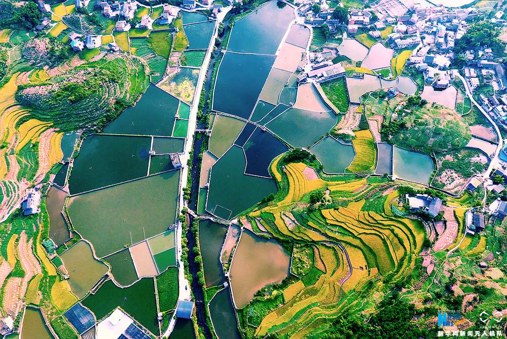 立秋之后,南方水稻逐漸成熟,金黃色的稻田呈現(xiàn)出別樣美景。在重慶市萬盛經(jīng)開區(qū)南桐鎮(zhèn)金龍村,金黃色稻田與魚塘相互映襯,田野的線條在稻田中穿梭,美不勝收。從空中俯瞰,猶如天然“調(diào)色板”,色彩斑斕。新華網(wǎng)發(fā) 曹永龍攝
