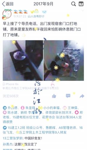 近日,一則關(guān)于商丘工學(xué)院“學(xué)生返校晚,怕打擾室友,門口打地鋪”的新聞,在朋友圈大量轉(zhuǎn)發(fā),上面配有幾張打地鋪的圖片。