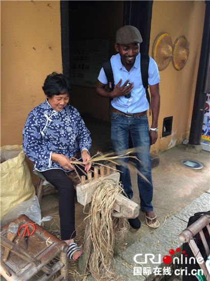 茨坪毛澤東舊居景點(diǎn)一位農(nóng)婦給游客示范草鞋的穿法