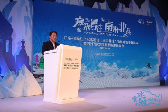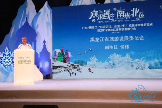 推介會開始后,廣東省旅游局副巡視員毛誠和黑龍江省旅游發(fā)展委員會副主任侯偉分別發(fā)表致辭。毛誠表達了對這場推介會的重視和肯定,他說道:“印象里,黑龍江的冬季是冰雪世界、純白的天堂,其最富代表性的‘北國風光’和廣東有著極大的差異性。‘冰雪之冠·暢爽龍江’吸引著全國游客,特別是廣東游客心之所想、身之前往!焙顐セ仡櫫藘墒÷糜尾块T對口合作取得的成就,向大家介紹了黑龍江優(yōu)質的冬季旅游資源,并且發(fā)出盛情邀請:“北上‘冰雪之冠’黑龍江吧,探尋未知的冰雪世界,走一趟精彩的冰雪發(fā)現之旅!”