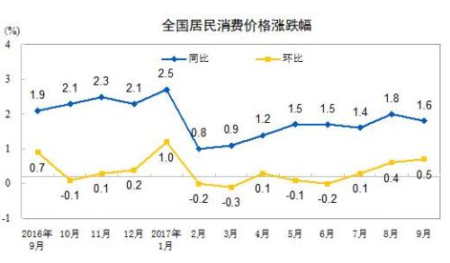 中新網(wǎng)10月16日電 據(jù)統(tǒng)計局網(wǎng)站消息,2017年9月份,全國居民消費(fèi)價格同比上漲1.6%。其中,城市上漲1.7%,農(nóng)村上漲1.4%;食品價格下降1.4%,非食品價格上漲2.4%;消費(fèi)品價格上漲0.7%,服務(wù)價格上漲3.3%。1-9月平均,全國居民消費(fèi)價格總水平比去年同期上漲1.5%。
