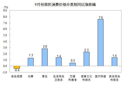 9月份,其他七大類價格同比均有不同程度的上漲。其中,醫(yī)療保健、居住、教育文化和娛樂價格分別上漲7.6%、2.8%和2.3%,生活用品及服務(wù)、其他用品和服務(wù)價格均上漲1.4%,衣著、交通和通信價格分別上漲1.3%和0.5%。