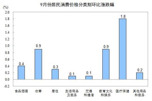 9月份,其他七大類價格環(huán)比均有不同程度的上漲。其中,醫(yī)療保健、居住、交通和通信價格分別上漲1.8%、0.3%和0.1%,其他用品和服務(wù)、生活用品及服務(wù)價格分別上漲0.2%和0.1%;衣著、教育文化和娛樂價格均上漲0.9%。
