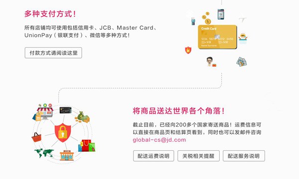 現(xiàn)在,全世界的海外消費者只要訪問京東網(wǎng)站全球售專區(qū)global.jd.com,即可便捷地找到可以配送到當?shù)氐膸资f高品質自營商品,以及由幾百萬第三方商家提供的豐富商品,而且所有這些售往全球的商品,均享受與中國國內(nèi)同等的商品價格與折扣。支付方式也靈活多樣,除了中國國內(nèi)的銀行卡與國際信用卡之外,還支持使用廣泛的微信支付,任何地方的消費者都可以輕松支付。