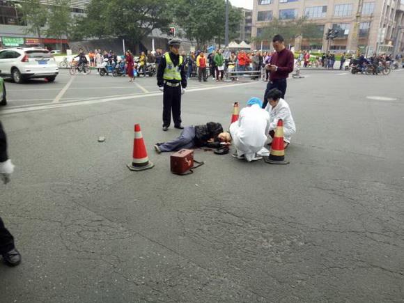 圖為老人落地后龔先程從附近醫(yī)院找來(lái)兩名醫(yī)生對(duì)老人進(jìn)行急救