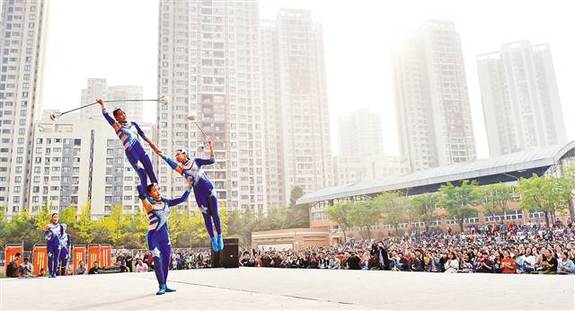 “同學(xué)們,少年強(qiáng)則國強(qiáng),你們這些大大小小的夢想?yún)R集起來,將筑成我們的中國夢!”11月7日,一臺精彩的表演在重慶市兩江育才中學(xué)的操場上上演——演員們除了為現(xiàn)場師生表演雜技外,還與他們頻繁互動。這是由重慶雜技藝術(shù)團(tuán)打造的“喜慶十九大共筑中國夢”送演出進(jìn)基層活動。