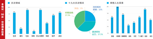 在訪問中,很多受訪者將“成就感”、“自由”、“美滿家庭”、“舒適”等作為理想人生要素。因此,很多“90后”的政治參與意識、對黨和國家大事的關(guān)注度更高。調(diào)查中,80%的受訪者表示“關(guān)注了十九大”,其中近75%的人表示“收看了現(xiàn)場直播”或“通讀了報告全文”。