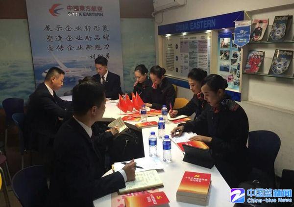 新藍(lán)網(wǎng)-中國藍(lán)新聞客戶端12月1日訊(記者王逸群 俞笛)11月30日上午,東航客艙部準(zhǔn)備室內(nèi)的桌面上擺滿了黨章、學(xué)習(xí)文件和筆記本,由上海飛往長沙的航班乘務(wù)組人員正在利用出發(fā)前的時間學(xué)習(xí)黨的十九大精神和近期的新聞。他們有一個共同的身份——東航“藍(lán)天黨小組”成員。