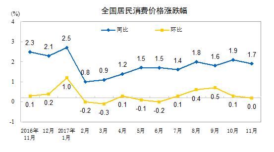 中新網(wǎng)12月9日電 據(jù)國(guó)家統(tǒng)計(jì)局網(wǎng)站消息,11月,全國(guó)居民消費(fèi)價(jià)格同比上漲1.7%。其中,城市上漲1.8%,農(nóng)村上漲1.5%;食品價(jià)格下降1.1%,非食品價(jià)格上漲2.5%;消費(fèi)品價(jià)格上漲0.9%,服務(wù)價(jià)格上漲3.1%。1-11月平均,全國(guó)居民消費(fèi)價(jià)格總水平比去年同期上漲1.5%。