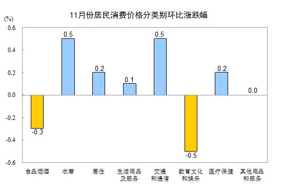 11月份,全國(guó)居民消費(fèi)價(jià)格環(huán)比持平。其中,城市和農(nóng)村均持平;食品價(jià)格下降0.5%,非食品價(jià)格上漲0.1%;消費(fèi)品價(jià)格上漲0.1%,服務(wù)價(jià)格下降0.1%。