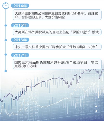 2015年,大商所在場(chǎng)外期權(quán)試點(diǎn)的基礎(chǔ)上首創(chuàng)“保險(xiǎn)+期貨”模式,引起廣泛關(guān)注。2016年中央一號(hào)文件首次提出“穩(wěn)步擴(kuò)大‘保險(xiǎn)+期貨’試點(diǎn)”,各保險(xiǎn)公司、期貨公司和地方政府積極響應(yīng)。