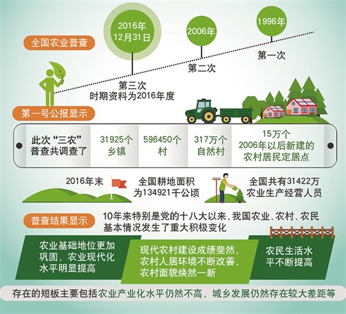 自2015年6月份起,國務院決定開展第三次全國農業(yè)普查。此次普查的標準時點為2016年12月31日,時期資料為2016年度,共調查了31925個鄉(xiāng)鎮(zhèn),其中鄉(xiāng)11081個,鎮(zhèn)20844個;596450個村,其中556264個村委會,40186個涉農居委會;317萬個自然村;15萬個2006年以后新建的農村居民定居點。