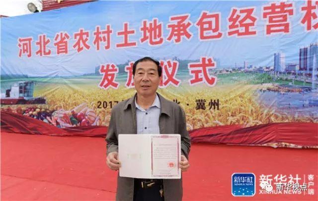 衡水市冀州區(qū)莊子頭村村民魏九明在展示領(lǐng)到的《農(nóng)村土地承包經(jīng)營權(quán)證》(4月19日攝)。4月19日,河北省農(nóng)村土地承包經(jīng)營權(quán)確權(quán)登記首批頒證儀式在衡水市冀州區(qū)莊子頭村舉行,14戶村民領(lǐng)到《農(nóng)村土地承包經(jīng)營權(quán)證》。新華社記者 王曉 攝