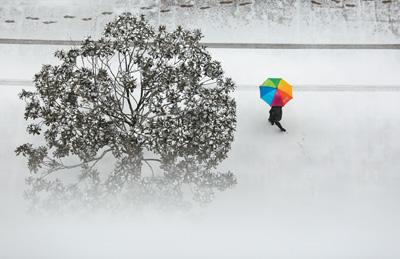 4日,山東省臨沂市郯城縣街頭,一名行人在雪中行走。張春雷攝(新華社發(fā))