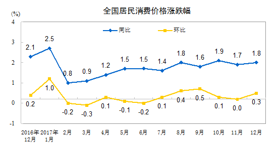 2017年12月份,全國居民消費價格同比上漲1.8%。其中,城市上漲1.9%,農(nóng)村上漲1.7%;食品價格下降0.4%,非食品價格上漲2.4%;消費品價格上漲1.1%,服務(wù)價格上漲3.0%。