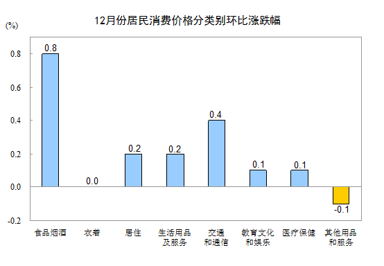 12月份,全國居民消費價格環(huán)比上漲0.3%。其中,城市上漲0.3%,農(nóng)村上漲0.4%;食品價格上漲1.1%,非食品價格上漲0.1%;消費品價格上漲0.5%,服務(wù)價格上漲0.1%。