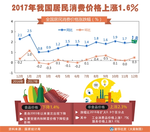 2017年全年,CPI同比上漲1.6%,漲幅比2016年回落0.4個百分點,重新回到“1時代”。食品價格下降1.4%,是自2003年以來首次出現(xiàn)下降,主要受豬肉和鮮菜價格下降較多影響。非食品價格上漲2.3%,漲幅比上年擴大0.9個百分點,其中,工業(yè)消費品價格上漲1.7%,服務(wù)價格上漲3.0%。