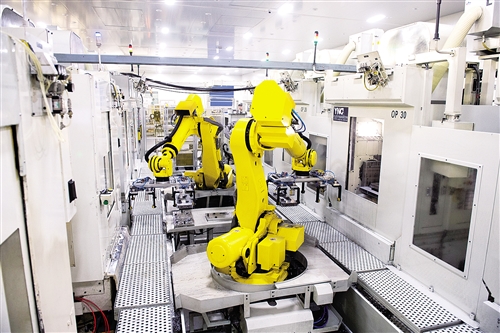 1月16日,機器人在瑞安市瑞明集團智能化托盤線上搬運物料。該生產(chǎn)線上,1個工人可操縱4臺機器人,輕松完成相當于以前30個工人的工作。 新華社記者 翁忻旸 攝
