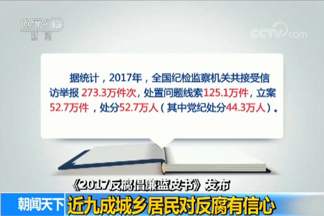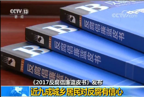 央視網(wǎng)消息:昨天,中國社科院中國廉政研究中心在京發(fā)布《2017反腐倡廉藍(lán)皮書》, 對(duì)十八大以來的全國黨風(fēng)廉政建設(shè)和反腐敗工作進(jìn)行了全面梳理,分析了社會(huì)認(rèn)同和期待。調(diào)查顯示,我國近九成城鄉(xiāng)居民對(duì)黨風(fēng)廉政建設(shè)和反腐敗斗爭(zhēng)有信心。