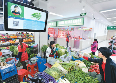 2017年11月29日,在安徽合肥瑤海區(qū)勝利智能農(nóng)貿(mào)市場,市民在掃碼支付。張大崗攝(新華社發(fā))