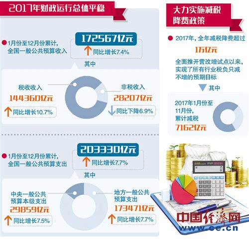 1月25日,財政部召開新聞發(fā)布會介紹2017年財政收支情況,去年財政運(yùn)行總體平穩(wěn),財政收入增速加快。據(jù)統(tǒng)計,2017年全國一般公共預(yù)算收入172567億元,同比增長7.4%,其中稅收收入144360億元,同比增長10.7%;全國一般公共預(yù)算支出首次突破20萬億元。